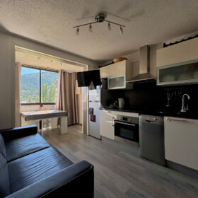 Le séjour, lumineux, s’ouvre lui aussi sur une loggia qui comprend un coin repas avec la même vue imprenable sur les montagnes. Une cuisine équipée et fonctionnelle complète l’espace de vie, avec de nombreux rangements.