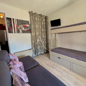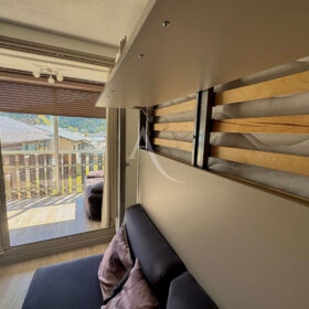 Dès l’entrée, un hall dessert l’ensemble des pièces. Vous trouverez tout d’abord une première salle d’eau avec WC, puis une chambre confortable dotée d’une loggia avec vue directe sur les pistes. Cette chambre dispose d’un placard astucieusement aménagé en lit escamotable, optimisant l’espace.